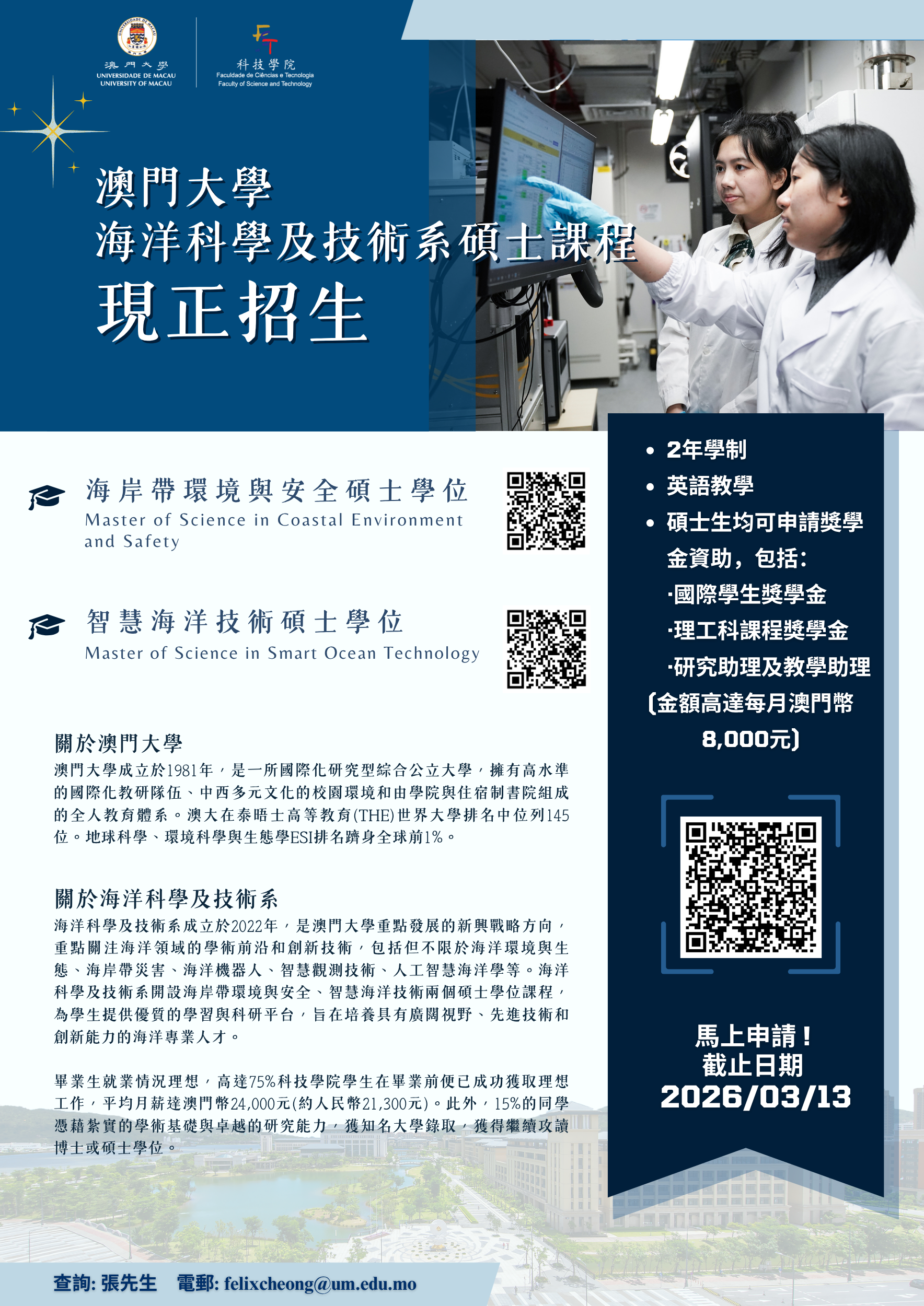 Currently, I am an Assistant Professor with the Department of Ocean Science and Technology at the Faculty of Science and Technology of the University of Macau.